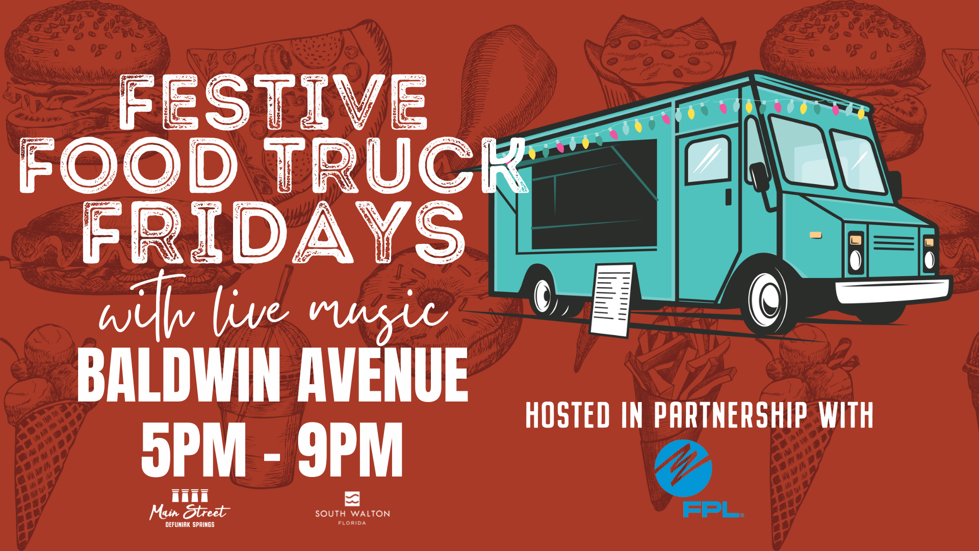 In addition to our regularly scheduled second Friday Food Truck Friday event, Main Street DeFuniak Springs will host a collection of local and regional food trucks and trailers the first and third Fridays in December from 5:00 p.m. to 9:00 p.m. as part of our Merry Main Street holiday events. This event is hosted in partnership with Florida Power & Light Company (FPL).