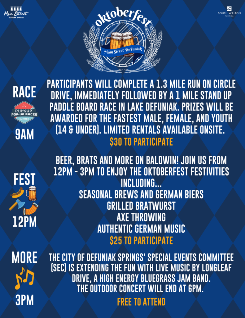 Main Street DeFuniak Springs will host its 3rd Annual Oktoberfest on Saturday, October 7, 2023, from 5:00 p.m. to 8:00 p.m. in Historic Downtown DeFuniak Springs. The event, held outdoors on Baldwin Avenue between S. 7th and S. 8th St. will feature craft German beer, assorted German-themed vendors, live music, axe throwing, and activities for kids and families.